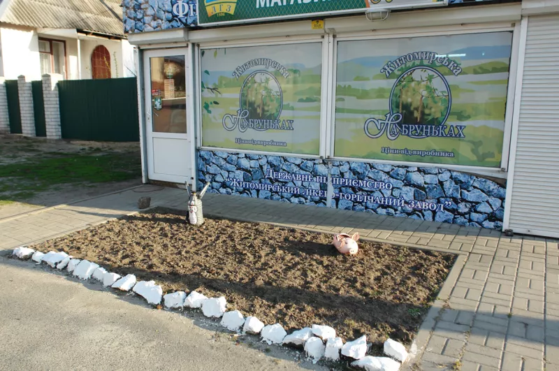 І ось, як виділився з-поміж інших власник фірмового магазинчику «Житомирська на бруньках», що неподалік адміністрації. На невеликій клумбі, обгородженій камінням, гарненько розмістились сіренький зайчик (дивно, та чомусь вираз його мордочки ну дуже нагадує обличчя однієї публічної особи в місті) і рожеве поросятко, зроблені із пластикових пляшок.