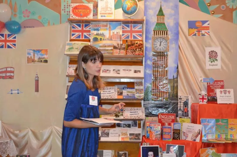 Презентація виставки "Книжковий Біг-Бен" перетворилась на чудове свято англійської мови. Стільки англійської в нашій бібліотеці не звучало ніколи. Головною героїнею свята звичайно була Міс Англійська мова – Mrs. English. Вона настільки вдало створила цікаву і веселу атмосферу, що байдужих не залишилось. І школярі, і вчителі, і самі бібліотекарі емоційно сприймали і брали участь у дійстві. Говорили про мову , про літературу, про компютерні ігри, відгадували книги англомовних авторів. Потім Mrs. English захотіла перевірити знання дітей з англійської мови. І наші юні читачі виявилися на висоті.