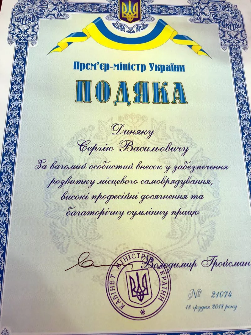 Сьогодні, 7 лютого, на пленарному засіданні сесії Житомирської обласної ради урочисто вручено Подяку Прем'єр-міністра України Володимира Гройсмана депутату Житомирської обласної ради Сергію Васильовичу Диняку "за вагомий особистий внесок у забезпечення розвитку місцевого самоврядування, високі професійні досягнення та багаторічну сумлінну працю".