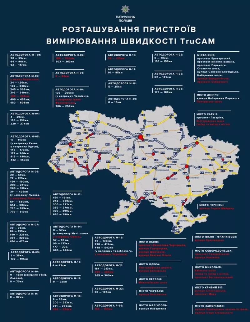 Нові ділянки, де відтепер будуть використовувати TruCAM, позначені червоним на карті та у табличці. Принципи нашої роботи незмінні: патрульні використовують TruCAM лише із розміщенням дорожніх знаків, що повідомляють про фото- відеофіксацію порушень, на ділянках автодоріг міжнародного значення та в містах із підвищеним рівнем аварійності унаслідок перевищення швидкості.