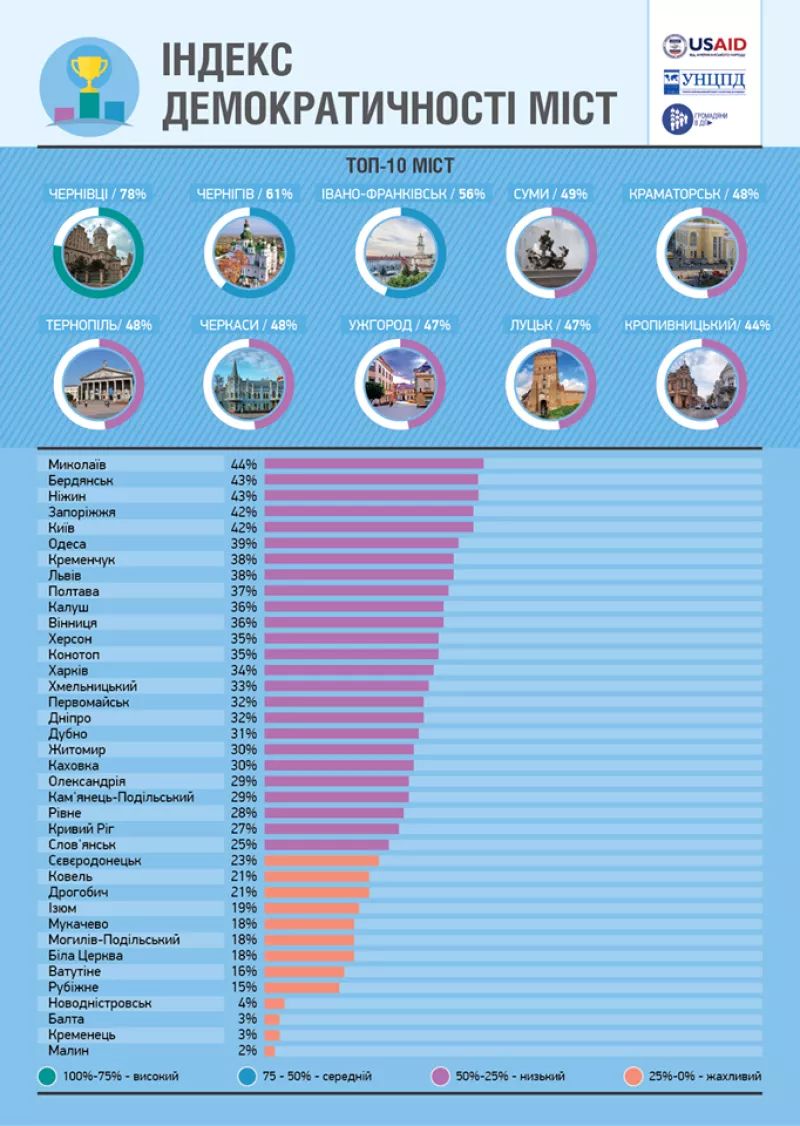У результаті оцінки кожного з інструментів місцевої демократії та відповідних нормативно-правих актів було визначено якість нормативного забезпечення демократичного управління у містах України та сформовано загальний рейтинг — Індекс демократичності міст. Максимальний рейтинг, який міста могли отримати за результатами оцінки кожного з інструментів та якості нормативно-правових актів — 100%.