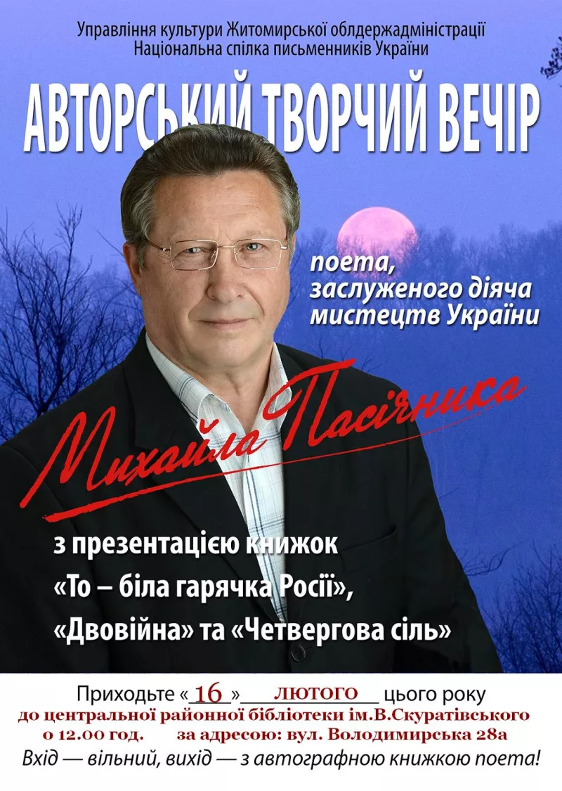 Малинська районна бібліотека імені Василя Скуратівського запрошує на авторський творчий вечір поета, заслуженого діяча мистецтв України Михайла Пасічника з презентацією книжок "То — біла гарячка Росії", "Двовійна" та "Четвергова сіль".