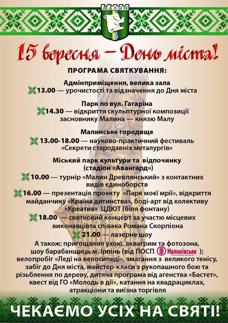 15 вересня Малин відзначає річницю свого заснування. Цього дня на мешканців нашого міста чекатиме насичена програма святкувань. Зокрема, відкриття скульптурної композиції князю Малу, турнір "Малин Древлянський" з контактних видів єдиноборств, презентація проекту "Парк моєї мрії", відкриття майданчика "Країна дитинства", святковий концерт та лазерне шоу.
