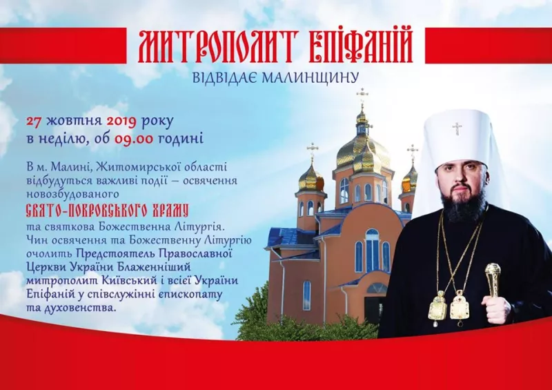 Цієї неділі, 27 жовтня, о 9.00 у Малині відбудуться освячення новозбудованого Свято-Покровського храму, що знаходиться в мікрорайоні Городища, та святкова Божественна Літургія. Чин освячення та Божественну Літургію очолить предстоятель Предстоятель Православної Церкви України Блаженніший митрополит Київський і всієї України Епіфаній у співслужінні єпископату та духовенства.