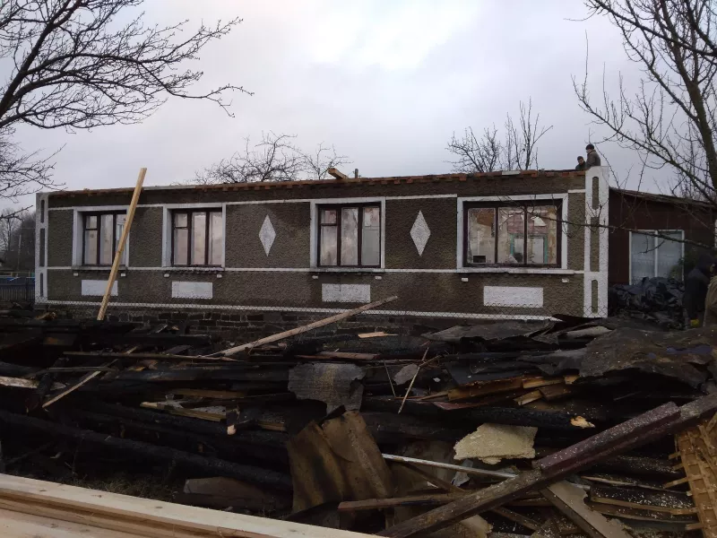 Картина, яку довелося побачити, виявилася не надто втішною. Сірий будинок стояв абсолютно без даху. На подвір’ї лежали згорілі балки, залишки речей. Однак на подвір’ї кипіла робота —. декілька чоловік працювали: переносили нові балки, прибирали сміття.