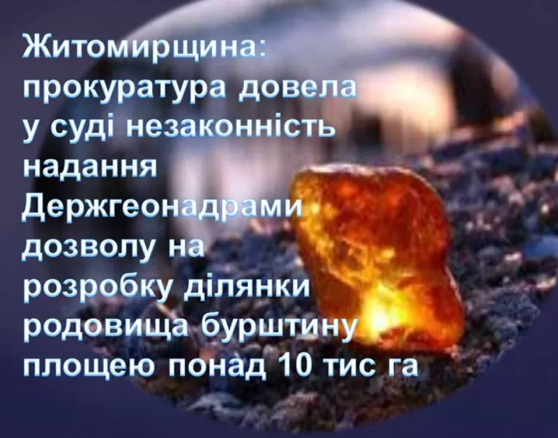 За позовом прокуратури Житомирської області судом визнано протиправним та скасовано спеціальний дозвіл на користування надрами, виданий Державною службою геології та надр України товариству з обмеженою відповідальністю «Амбер Холдинг» для геологічного вивчення, у тому числі дослідно-промислової розробки родовища бурштину площею понад 10 тис га.