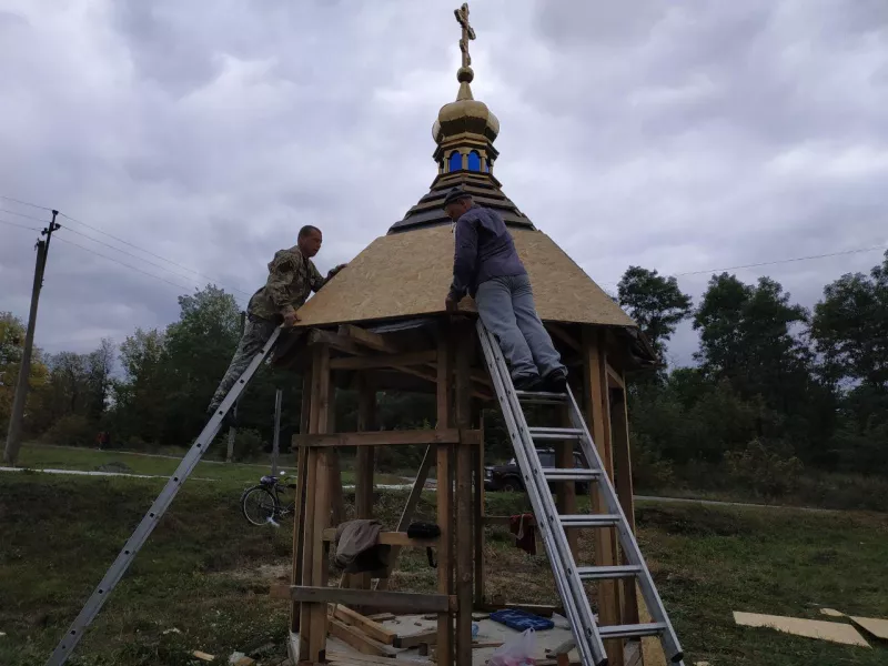 От і сьогодні сьогодні, 2 жовтня, воїни-атовці, а саме Голова Малинської міськрайонної асоціації учасників бойових дій Віктор Пінчук та його заступник Віктор Кононський продовжили будівництво каплиці у парку.