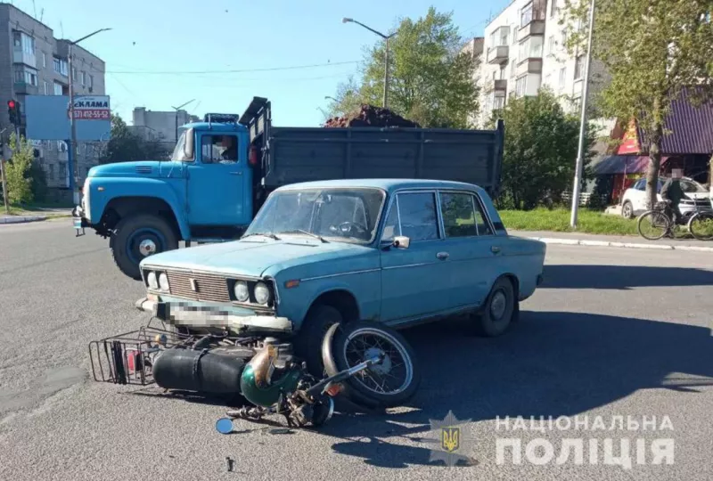 Дорожньо-транспортна пригода сталася 12 травня близько 07:45 на перехресті вулиць Приходька-Чорновола-Гагаріна у м. Малині. Тілесні ушкодження отримав водій двоколісника.
