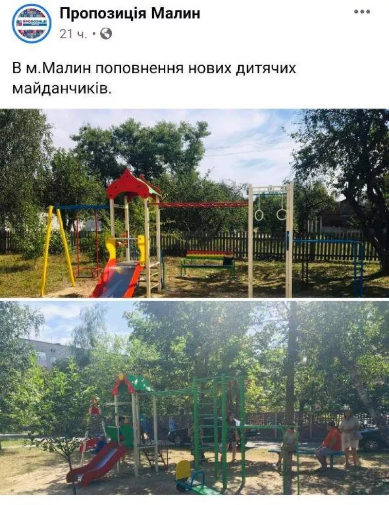 Однак, як з'ясувалося, "Пропозиція" в Малині не має жодного відношення до придбання і встановлення цих дитячих майданчиків. Малинчани отримали нові майданчики завдяки позиції депутата обласної ради Олега Дзюбенка, який залучив кошти на їх придбання з обласного бюджету.