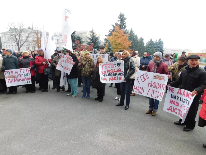 «Зупинимо вирубку лісу» — під такою назвою у середу під приміщенням адміністрації в Малині відбулась акція протесту, яку провела організація «Дістало». На передньому плані з рупором — помічник політичного діяча нашого регіону Віталія Журавського. Перед білим домом — маса людей, може, й більше сотні, із плакатами про короїдів-чиновників тощо.