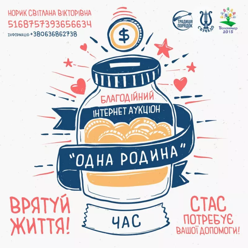 Волонтери «БФ «Волонтер 2015» і ГО «Свічадо», а також активісти консервативного руху «Традиція і Порядок» ініціюють благодійний аукціон «Одна родина» задля допомоги восьмирічному малинчанину Станіславу Норику. Хлопчик бореться зі страшним онкозахворюванням, яке нині перебуває уже на четвертій стадії – лімфомою Беркіта. Попереду на нього чекає новий етап тривалого лікування, який коштує десятки тисяч гривень, тож наша допомога для нього і родини вкрай необхідна.