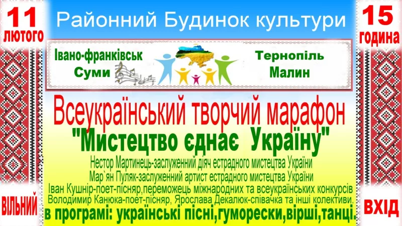 У суботу, 11 лютого, о 15:00 у Малинському районному Будинку культури пройде благодійний концерт, який дасть початок Всеукраїнському творчому марафону «Мистецтво єднає Україну».