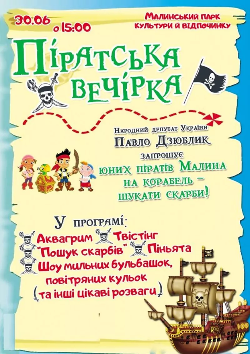 30 червня о 15:00 у Малинському парку культури й відпочинку відбудеться крута піратська вечірка. Народний депутат України Павло Дзюблик запрошує юних піратів Малина на корабель — шукати скарбів.