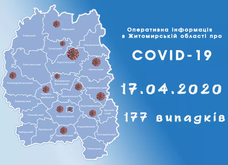 Станом на 9:00 17 квітня 2020 року на Житомирщині лабораторно підтвердженими є 177 випадків COVID-19. За минулу добу вірусологічна лабораторія Житомирського обласного лабораторного центру підтвердила COVID-19 ще у 15 жителів області, 11 з яких житомиряни.
