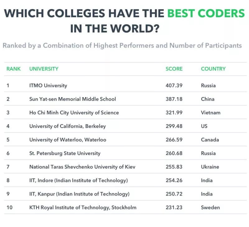 За дослідженням аналітиків сайту HackerRank, Київський національний університет імені Тараса Шевченка ввійшов у ТОП-10 вишів світу, в яких готують кращих кодерів. Він розташувався на 7 місці.
