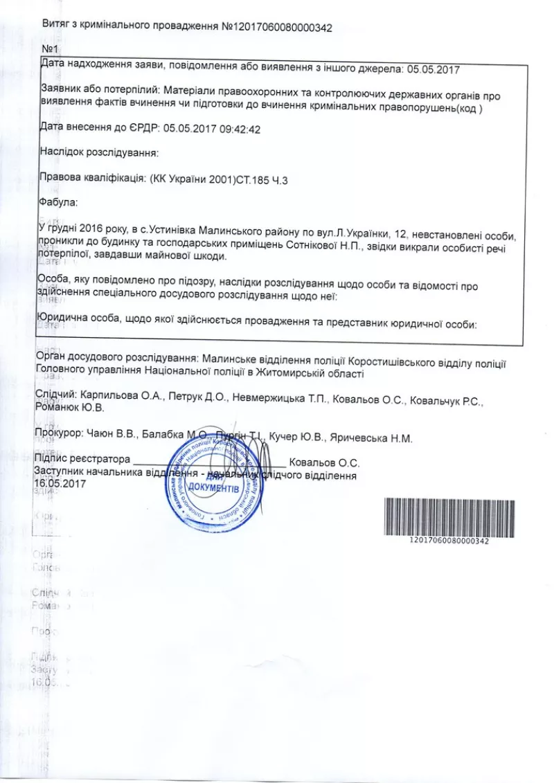 — У поліцію з заявою Наталія Петрівна звернулась 14 січня 2017 року, наступного дня її було внесено в ЄРДР, — пояснює адвокат і додає: — Мусимо самі шукати викрадені речі, оскільки малинська поліція не проводить слідчих дій, наскільки мені це відомо.