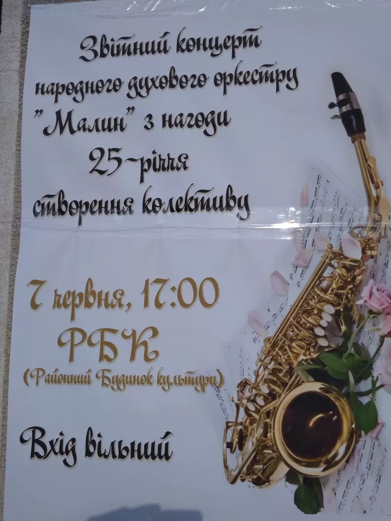 Завтра, 7 червня, о 17:00 в районному Будинку культури відбудеться відбудеться звітний концерт народного духового оркестру "Малин" з нагоди 25-річчя створення колективу.