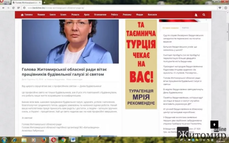 Наведемо доказ цьому. На офіційному веб-сайті обласної ради є привітання Анжеліки Лабунської для працівників будівельної галузі з нагоди професійного свята. Аналогічний тест розміщений на сайті «Бердичів діловий». У двох випадках під текстами є підпис «Голова Житомирської обласної ради Анжеліка Лабунська», а на бердичівському ресурсі ще й «Голова обласної партійної організації ВО «Батьківщина».