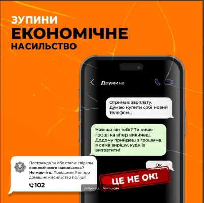 Постраждали або стали свідком економічного насильства? Не мовчіть! Телефонуйте за номером 102 та викликайте поліцію. Економічне насильство – це не ОК! У рамках міжнародної акції «16 днів проти н...