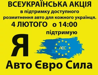 4 лютого о 14:00 у Києві відбудеться Всеукраїнська акція в підтримку доступного розмитнення авто для кожного українця. Акцію організовує громадська організація "Авто Євро Сила". За довідками зв...