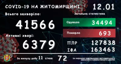 Обласний лабораторний центр повідомляє: Станом на 09:00 12 січня 2021 року у Житомирській області виявлено 6379 активних хворих на COVID19 та зареєстровано вже 41 566 підтверджених випадків COVID-19 ...