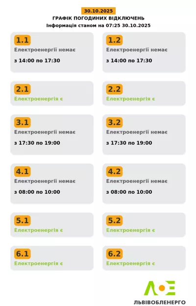 Сьогодні, 30 жовтня, АТ «Чернівціобленерго» оприлюднило графік відключення світла для споживачів Чернівців та інших населених пунктів Буковини, пов'язаний із запровадженням обмежень електроенергії чер...