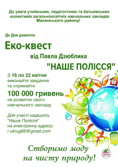 16 квітня стартував еко-квест «Наше Полісся», який проходить за сприяння народного депутата України Павла Дзюблика. На початок конкурсу у ньому вже зареєстровано 15 шкіл міста і району. Так, серед...