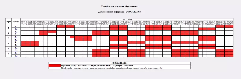 Станом на 18 грудня 2025 року в Житомирській області діють графіки погодинних відключень електроенергії, запроваджені відповідно до розпоряджень НЕК «Укренерго». Обмеження застосовуються для стабілізації енергосистеми та можуть змінюватися протягом доби залежно від навантаження.