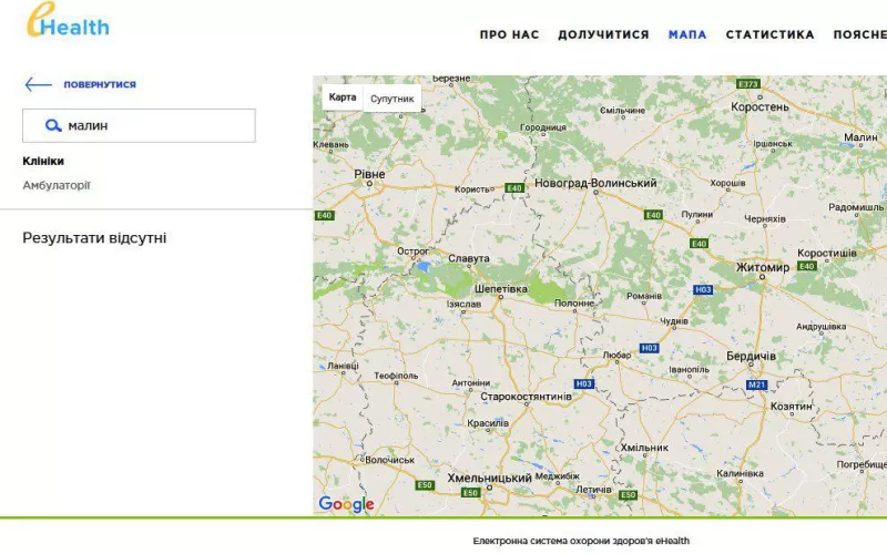 Важко сказати, чому жодного медзакладу Малина і району немає в системі. Можливо, стався збій системи, можливо ввели некоректний запит у пошуку, можливо, деякі дані просто не відображаються звичайному відвідувачу. Однак факт залишається фактом: ні Малинського МРЦПМСД, ні будь-якого іншого медичного закладу міста і району знайти в системі eHealth так і не вдалося.