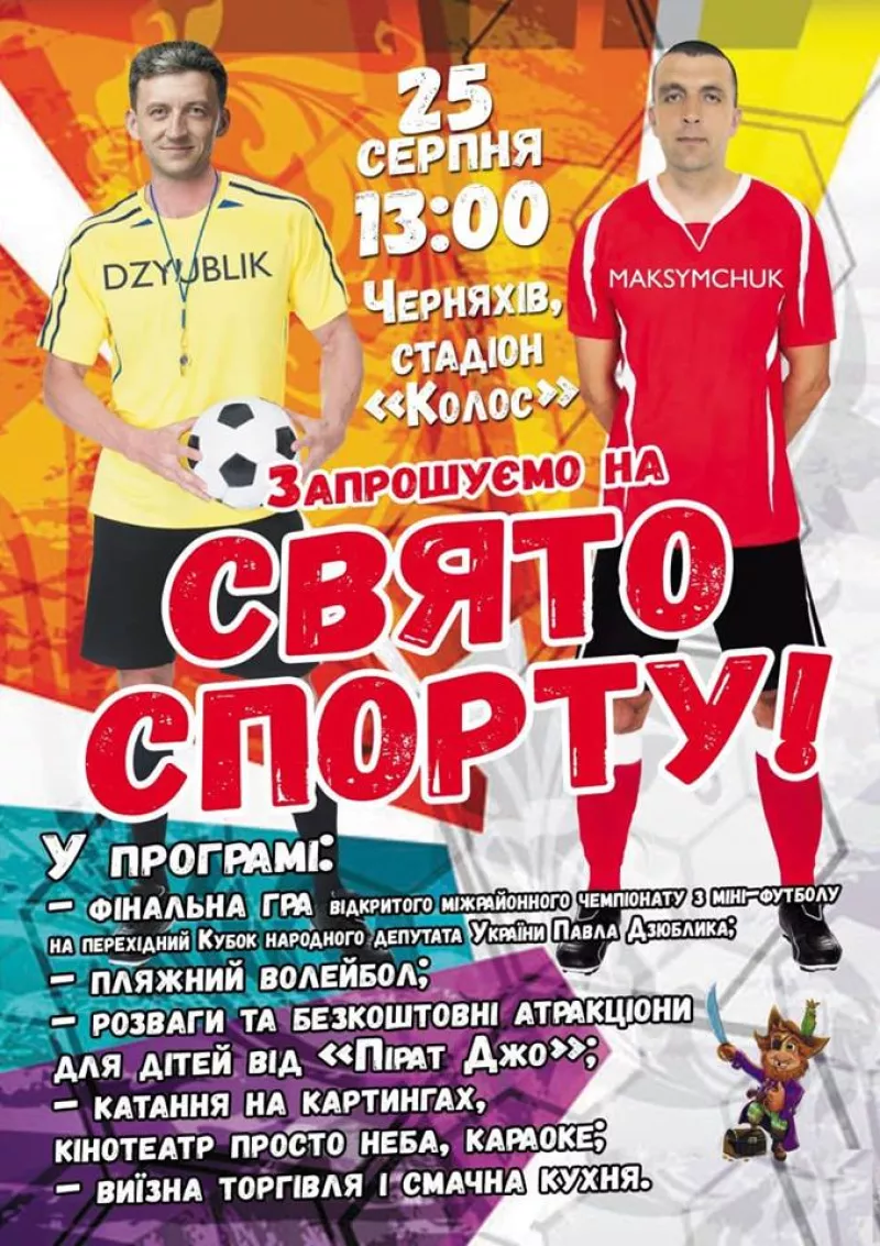 25 серпня, в суботу, з 13.00 до самого вечора на Черняхівському стадіон «Колос» — фінал відкритого міжрайонного чемпіонату з міні-футболу на перехідний Кубок народного депутата України Павла Дзюблика. Силами мірятимуться кращі команди Брусилівського, Коростишівського, Народицького, Радомишльського, Хорошівського та Черняхівського районів. І, звичайно, представники Малинщини — команда ФК "Будівельник", які стали переможцями районного етапу турніру.