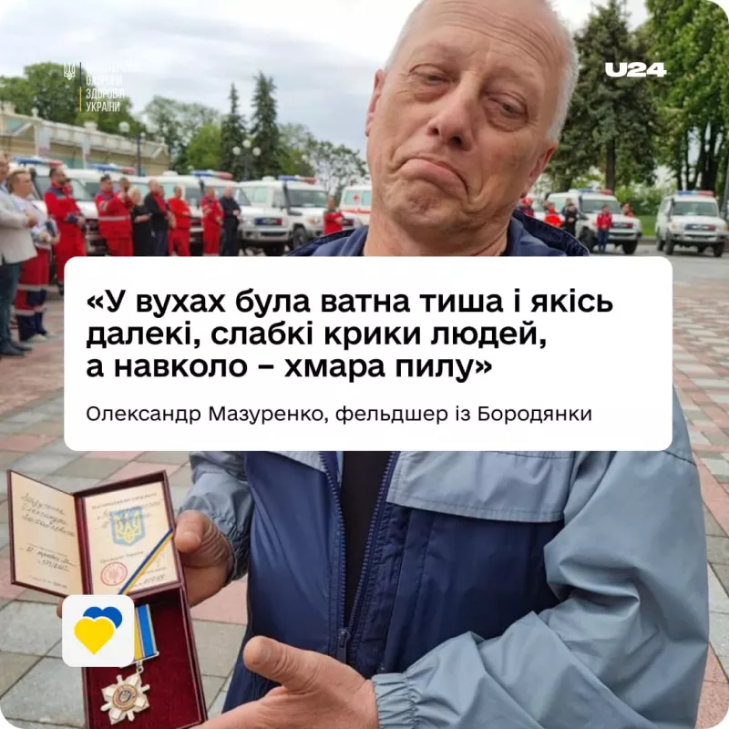 Читайте оповідь Олександра про перші дні окупації, ті самі бомби, які скидали на багатоповерхівки Бородянки, та роботу швидкої під нещадними обстрілами. Олександр отримав орден «За мужність» ІІІ ступеня, і ви зрозумієте – чому.