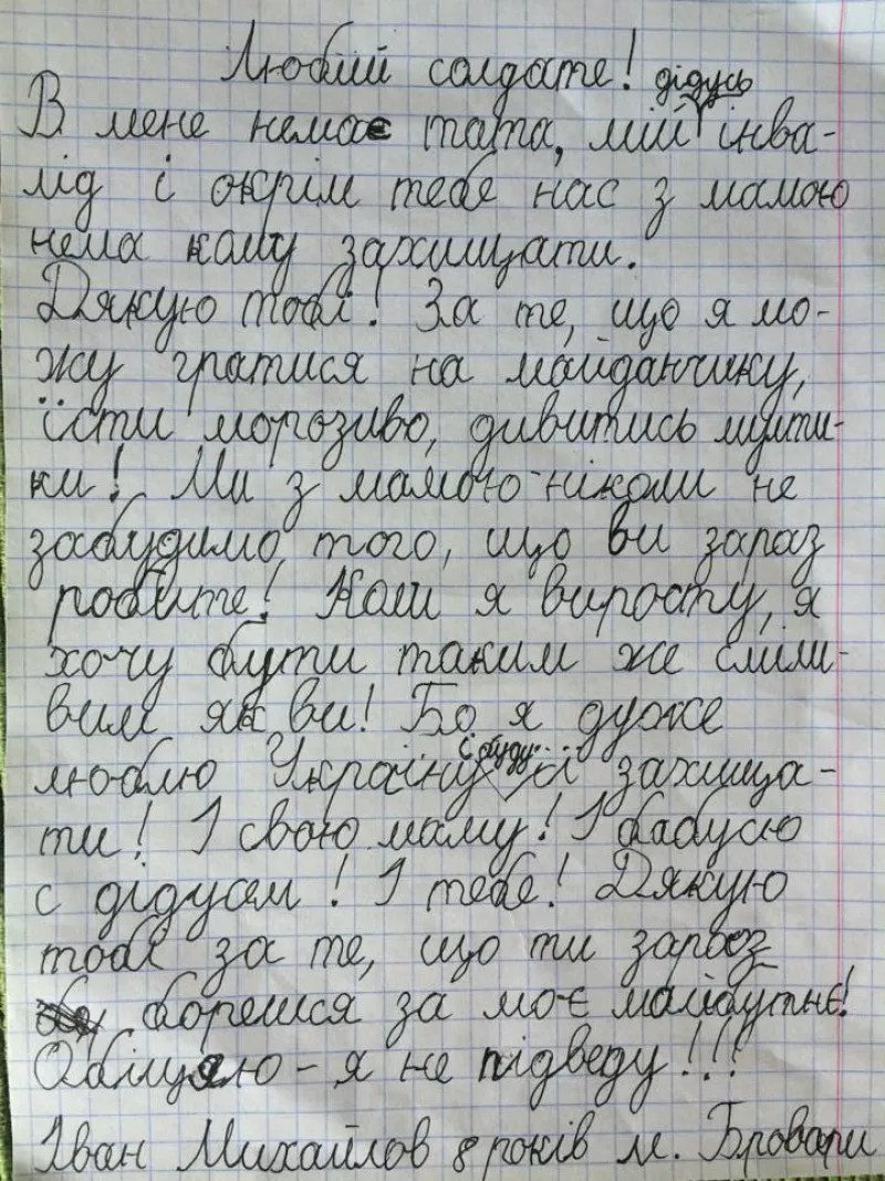 Любий солдате в мене немає тата, мій дідусь інвалід і окрім тебе нас з мамою нема кому захистити. Дякую тобі за те, що я можу гратися на майданчику їсти морозиво, дивитись мультики! Ми з мамою ніколи не забудемо того, що ви зараз робите!