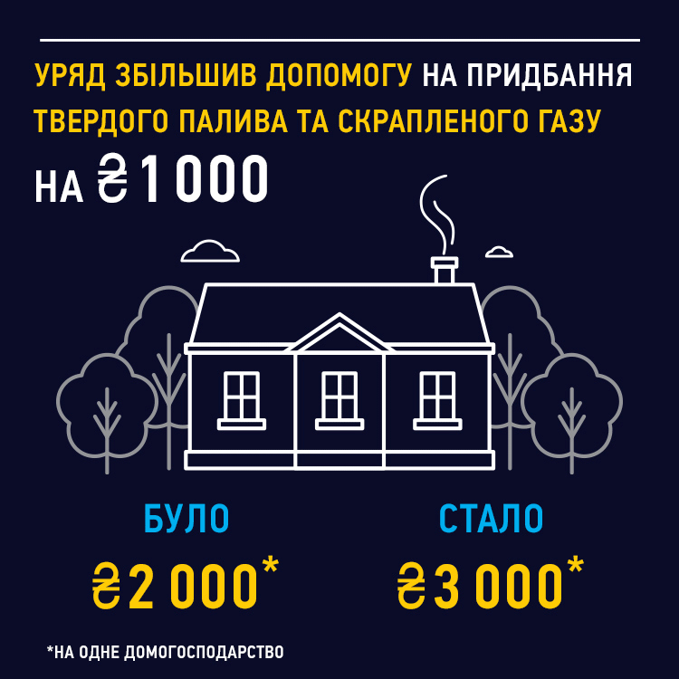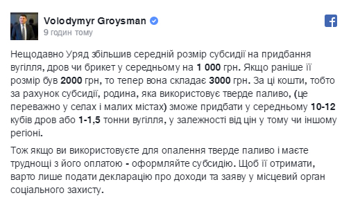 «Нещодавно уряд збільшив середній розмір субсидії на придбання вугілля, дров або брикет у середньому на 1 000 гривень. Якщо раніше її розмір був 2 000 гривень, то тепер вона становить 3 000 гривень, — пише Гройсман. — Тому, якщо ви використовуєте для опалення тверде паливо і є труднощі з його оплатою — оформляйте субсидію».