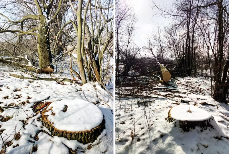 На таку знахідку — більше десятка дубових пнів, які досягають у діаметрі до півметра, і залишених напризволяще крон — натрапили, прогулюючись мальовничою місцевістю й милуючись зимовими краєвидами неподалік міста. Зокрема, вікові дерева невідомі лісоруби зрізали в невеликій лісопосадці вздовж берегу Ірші, що між «калюжею» і новим териконом Малинського каменедробильного заводу.