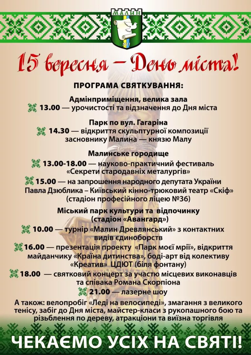 15 вересня до Дня міста у Малині проходитиме багато цікавих і феєричних заходів. Зокрема, на малинчан і гостей міста чекає відкриття скульптурної композиції легендарному засновнику Малина — князю Малу у фабричному парку. науково-практичний фестиваль "Секрети стародавніх металургів" та виступ Київського кінно-трюкового театру "Скіф", запрошений нардепом Павлом Дзюбликом.
