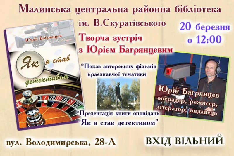 20 березня до центральної районної бібліотеки ім. В.Скуратівського завітає цікавий гість – Юрій Багрянцев.