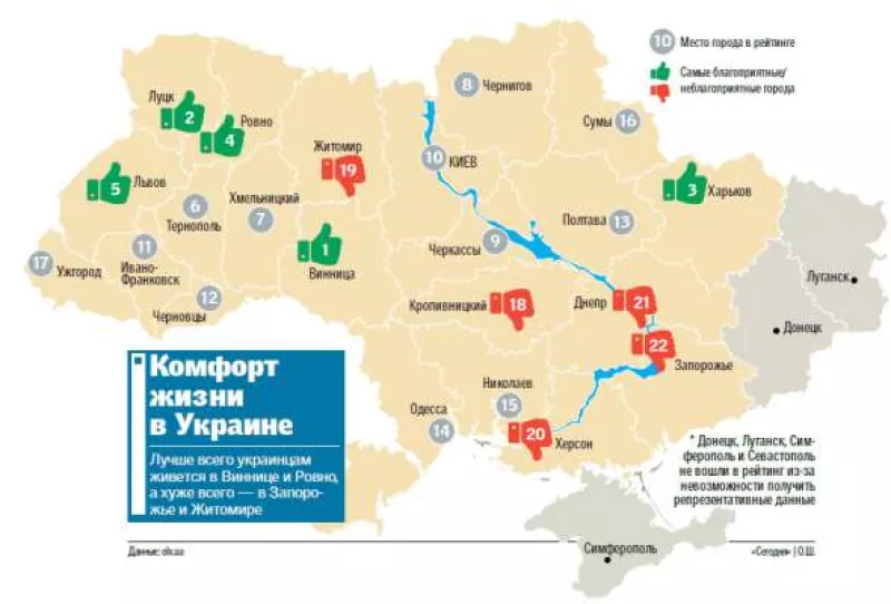 Серед аутсайдерів рейтингу - Запоріжжя з поганою екологією і Дніпро, де українців не влаштовує дефіцит спортивних і культурних закладів. Третє місце з кінця поділили Житомир і Херсон. Там відзначені проблеми з екологією, безпекою та інфраструктурою.