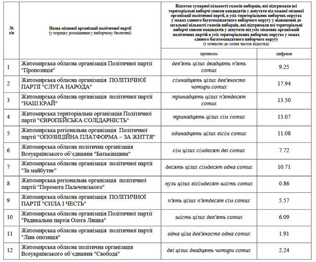 Загальні результати 12 партій, які висували своїх кандидатів в депутати Житомирської обласної ради: