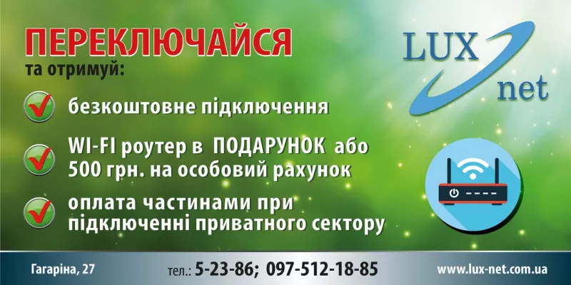 Ви незадоволені швидкістю, якістю або ціною? Підключейте безкоштовно* якісний, безлімітний Інтернет від компанії "ЛЮКС.НЕТ" та отримуйте бонус: