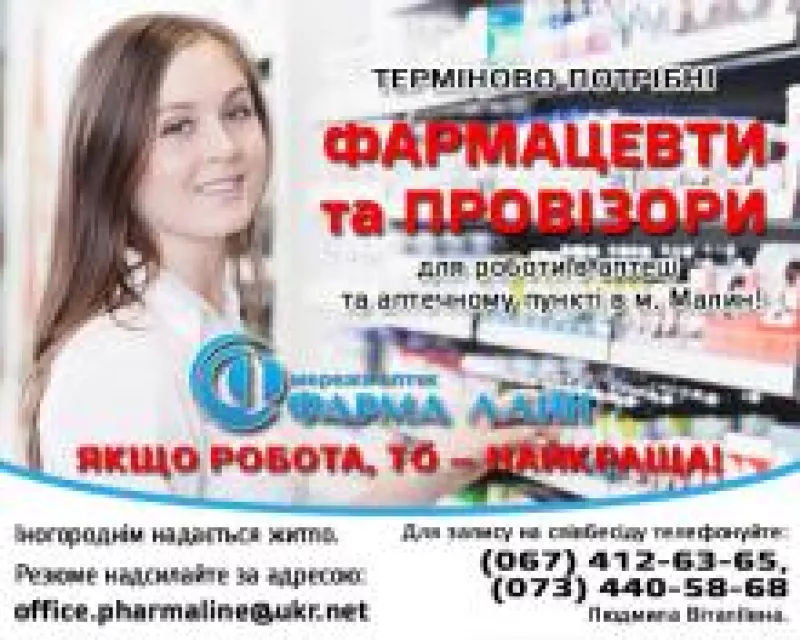 Аптечна мережа "Фарма Лайн" запрошує на роботу провізорів та фармацевтів в м.Малин. Свої резюме відсилайте за адресою [email protected], для запису на співбесіду дзвоніть за номерами (067) 412-63-65, (073) 440-58-68 Людмила Віталіївна