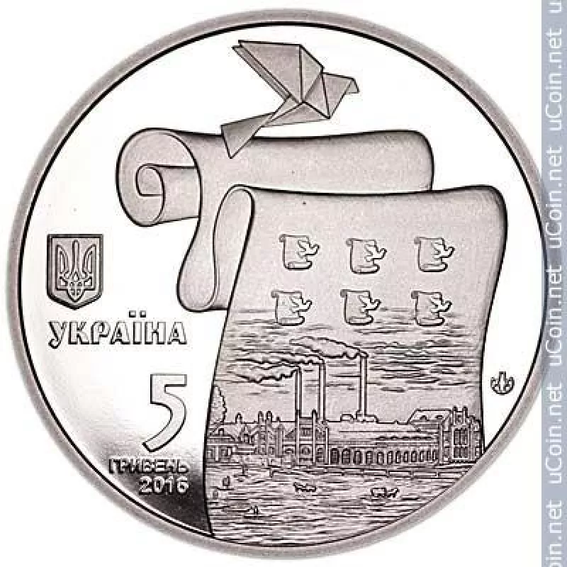 На лицьовій стороні монети зображення сувою банкнотного паперу, де розміщено паперову фабрику, яка розпочала свою роботу в Малин і з II пол. XIX ст.; угорі – стилізованого паперового птаха; ліворуч – малий Державний Герб України, напис «УКРАЇНА», номінал «5 ГРИВЕНЬ», рік карбування монети «2016» та логотип Банкнотно-монетного двору Національного банку України (праворуч).