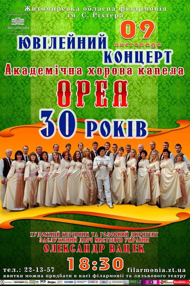 У приміщенні Житомирської обласної філармонії 9 листопада о 18.30 відбудеться святковий концерт з нагоди 30-річчя творчої діяльності хорової капели «Орея».
