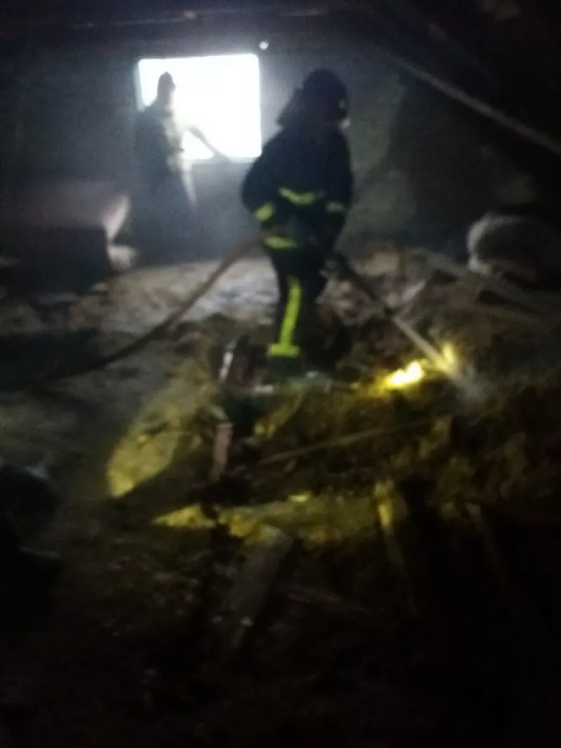 На місці події всередині оселі відчувалося незначне задимлення, видимих ознак горіння не було. Керівник гасіння пожежі викликав на допомогу друге відділення вогнеборців, і у складі двох ланок газодимозахисної служби вони провели розвідку для виявлення осередку займання. Як з’ясувалося, на горищі місцями горіло дерев’яне перекриття, конструкції якого всередині утеплені тирсою.