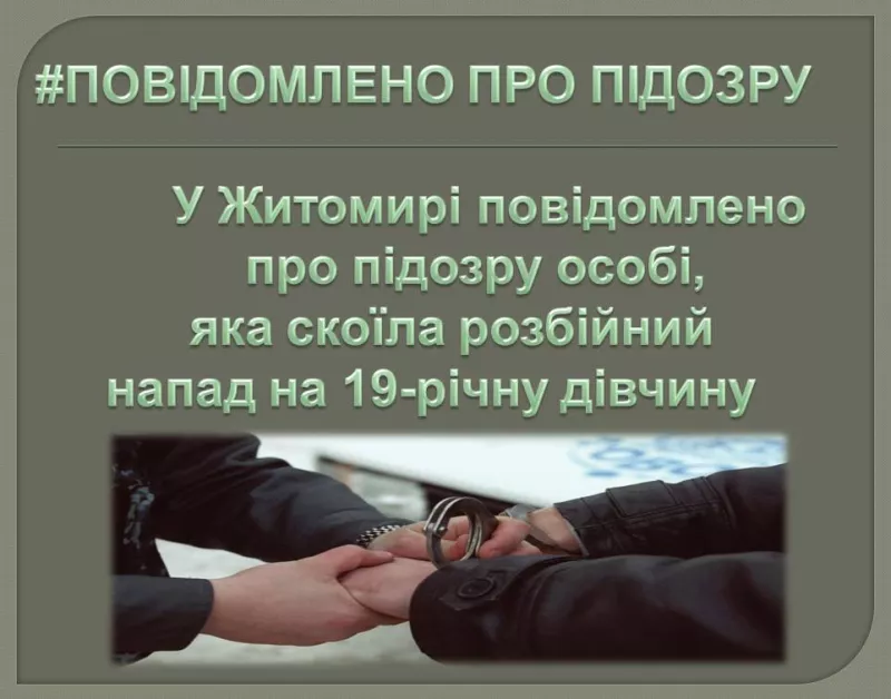 У вівторок, 23 січня 2018 року, за погодженням із Житомирською місцевою прокуратурою, жителю м. Житомира повідомлено про підозру у скоєнні розбійного нападу, поєднаного із заподіянням тяжких тілесних ушкоджень 19-річній житомирянці.