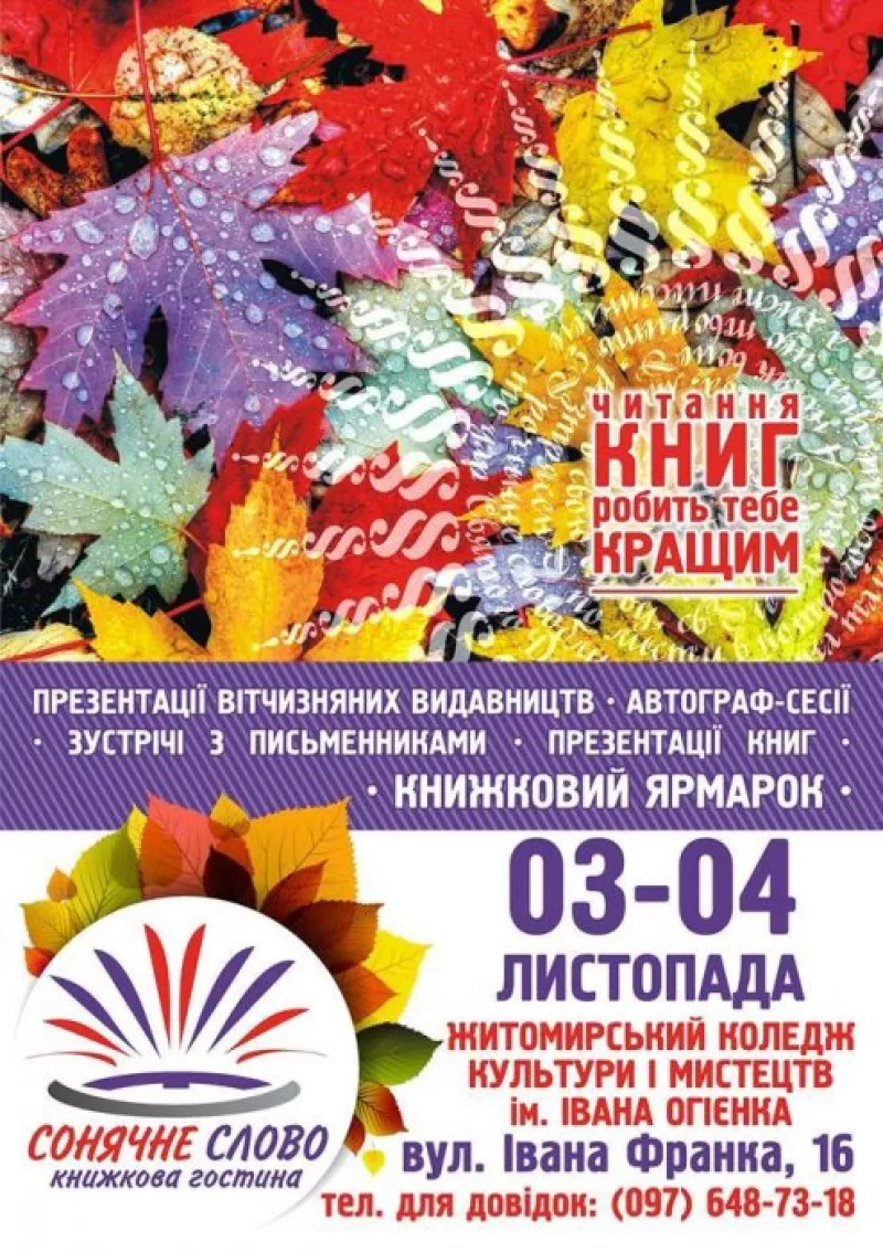 Житомирський коледж культури і мистецтв імені Івана Огієнка вже третій рік поспіль організовує регіональний форум видавців. Щоправда, у Житомирі такий захід має оригінальну назву – книжкова гостина «Сонячне слово».