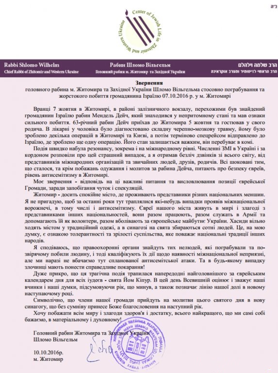 «Житомир — досить спокійне місто, де проживають представники різних національних меншин. Я не пригадую, щоб за останні роки тут траплялися які-небудь випадки проявів міжнаціональної ворожнечі, в тому числі і антисемітизму. Євреї нашого міста живуть в мирі і злагоді з представниками інших національностей, вони разом працюють, разом служать в Армії та допомагають їй як волонтери, разом вболівають за європейське майбутнє України. Хасиди вільно ходять містом у традиційній одежі, а в синагозі на свята збираються сотні людей. Це, на мою думку, є ознакою толерантності та зрілості суспільства, яке поважає національні традиції інших народів. Я сподіваюся, що правоохоронні органи знайдуть тих знайдуть нелюдей, які пограбували та по-звірячому побили людину, і тоді кваліфікують їх дії щодо наявності міжнаціональної неприязні, але ми наразі не вбачаємо тут спланованої антисемітської атаки», — зазначає рабин.