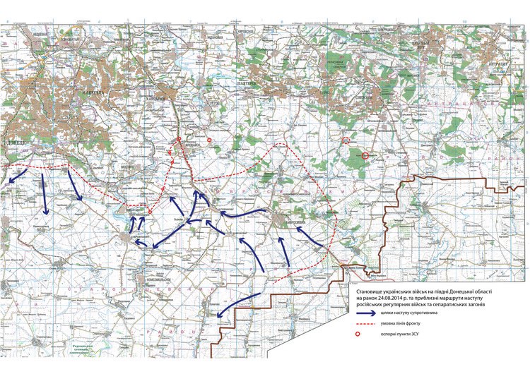 Приблизні маршрути наступу сепаратистських загонів та колон російської регулярної армії 23-24 серпня 2014 року