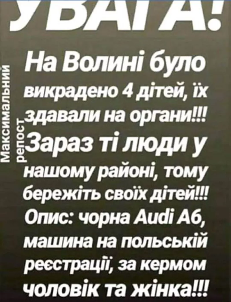 Зокрема ще у серпні zaxid.net писав, що протягом останнього тижня у соцмережах почастішали дописи про те, що невідомі на авто з польськими номерами намагаються викрасти дітей, щоб здати їх на органи. Як зазначало видання, про спорби нібито викрасти дітей писали на Волині, Рівненщині, а пізніше і на Львівщини. Правоохоронці ж спростували ці повідомлення, назвавши їх фейковими.