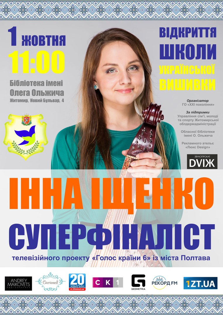 1 жовтня 2016 року з 11:00 до 14:00 у Мистецькому відділі Житомирської обласної універсальної біблітеки імені Олега Ольжича відбудеться урочисте відкриття Школи Української Вишивки на 2016-2017 роки. Організатори – Громадська організація «ХХІ покоління».