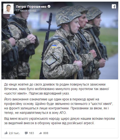 «До кінця жовтня до своїх домівок та родин повернуться захисники Вітчизни, яких було мобілізовано минулого року протягом так званої «шостої хвилі». Підписав відповідний указ. Його виконання означатиме ще один крок в переході армії на професійну основу. Щойно буде звільнено останнього з «шостої хвилі», на фронті залишаться лише контрактники. Призовники за віком, як і тепер, не направлятимуться в зону АТО. Від імені всього українського народу щиро дякую нашим воїнам-героям за видатний внесок в оборону країни від російської агресії», — написав Порошенко.